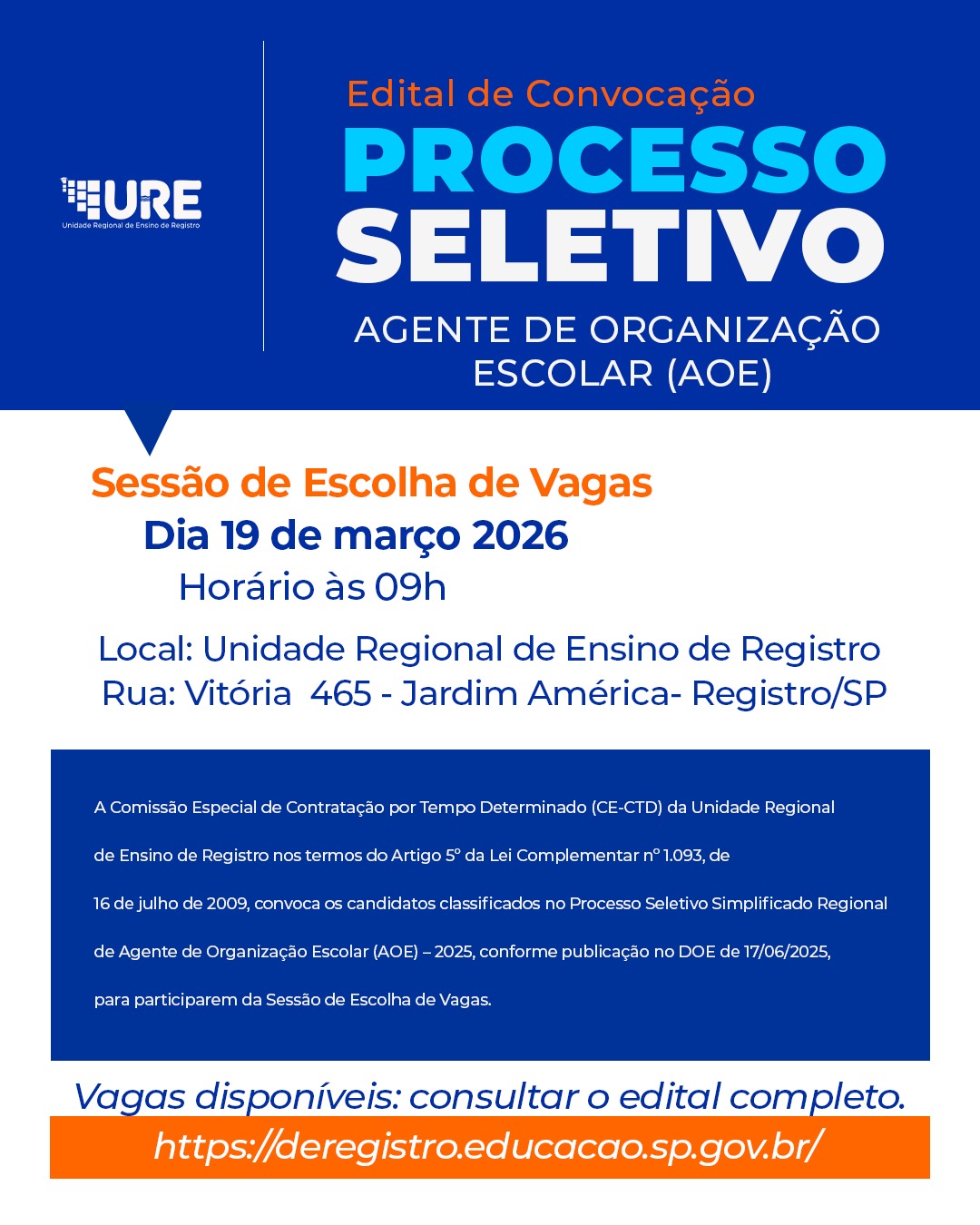 - EDITAL DE SELEÇÃO DE PROFESSORES PARA A ESCOLA OLÍMPICA – 2026A Chefe de Departamento Dirigente Regional de Ensino de Registro, Cláudia Ferreira Pitsch, com fundamento no … Leia mais »