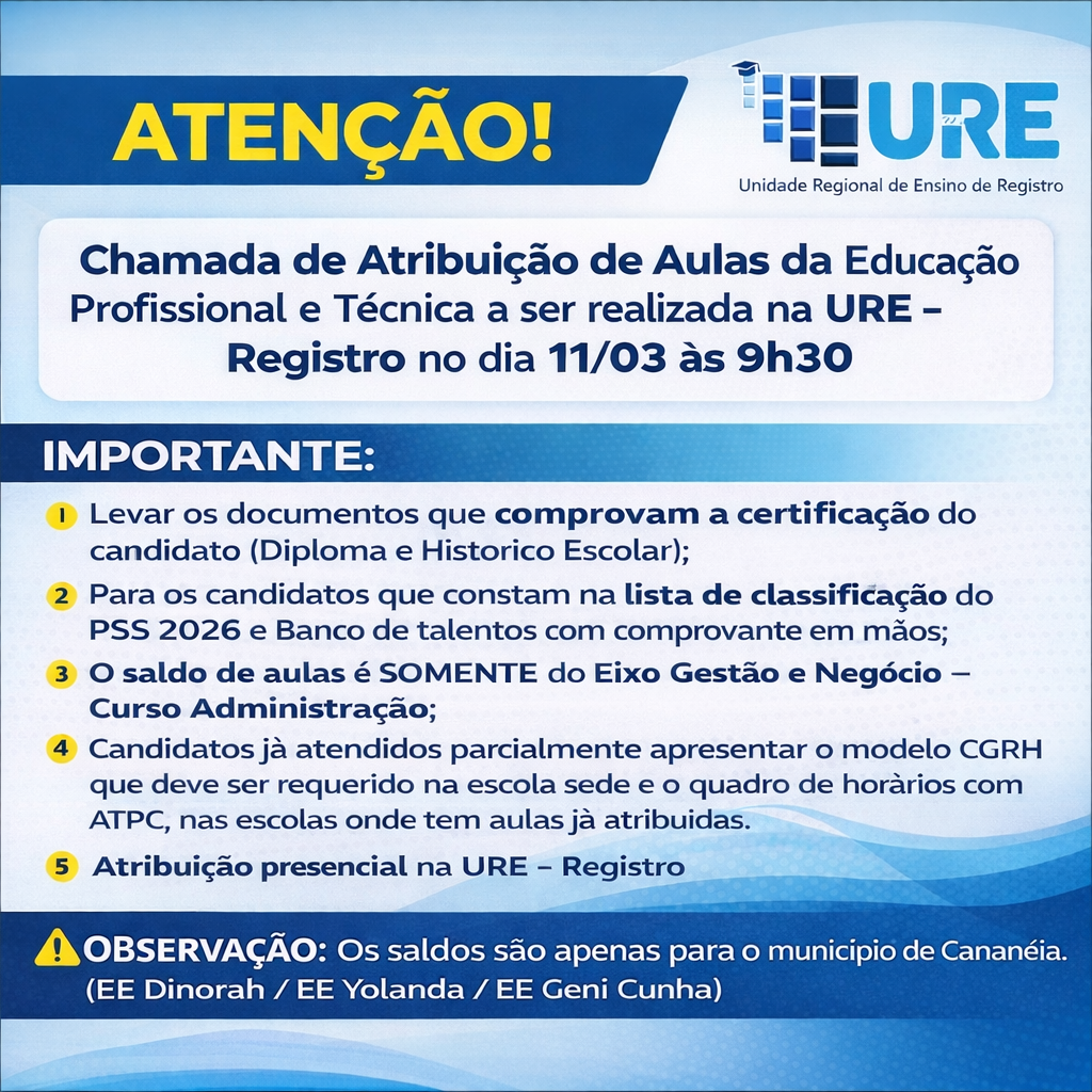 - EDITAL ATRIBUIÇÃO DE AULA ESCOLAS PEI 2026A Chefe de Departamento – Dirigente Regional de Ensino da Unidade Regional de Ensino de Registro, … Leia mais »